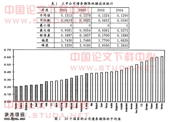 表1中的平均值一栏显示,上市公司的平均债务期限约为0.13,即长期债务在全部债务中所占比例约为13%。根据Demirg-Kunt&Maksimovic(1998)对19个发达国家与11个发展中国家的公司债务期限的研究,发达国家中,平均债务期限最长的是挪威,约为0.63,最短的是英国,约为0.28;发展中国家中,平均债务期限最长的是南非,约为0.38,最短的是巴基斯坦,约为0.20(见图1)。可见,即使是平均债务期限最短的巴基斯坦也比我国上市公司的平均债务期限长,这就表明我国上市公司的债务期限是相当偏短的。再由表2中的中位数一栏可以看出,有一半的上市公司其债务期限在0.06以内,即长期债务只占企业全部债务的6%。表1中的最下面三栏显示,上市公司的债务期限长短不一,差异较大,最短的为0,最长的接近1,即几乎全部为长期债务。此外,由表1还可以看出,债务期限的各种特征指标在四年中表现得极为相似。这表明,从总体上来看,上市公司的债务期限具有稳定的特征,且这种特征并不随时间变化而变化。