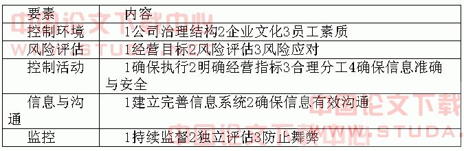 本文将遵循COSO框架的五要素,即控制环境,风险评估,控制活动,信息与沟通,监控[11],从这五个方面分别对上市公司的内部控制提出具体的建议。具体五个方面的内容见下表: