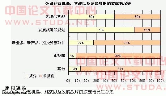 但是在披露上仍然有许多不足,比如公司的经营战略和经营目标的披露上,大多数的公司仍是以空泛性、条目性的披露居多。各公司在经营目标方面的披露尽管有一半的公司都进行了盈利数据的预测,但是仅披露相关数据却缺乏较强的说服力。对行业变化趋势和市场竞争格局变化对公司可能产生的影响程度的仅有7家而且披露相对简单、宽泛且没有数据分析和预测。在项目资金的需求和利用的披露也显得苍白不足,很多公司仅仅一句带过。