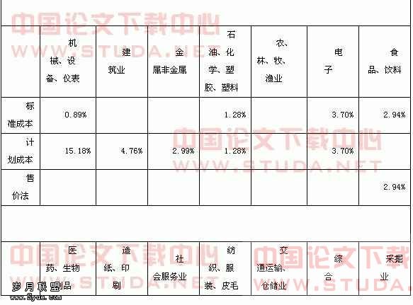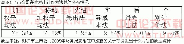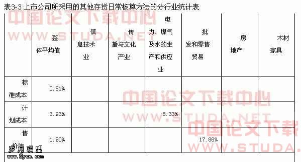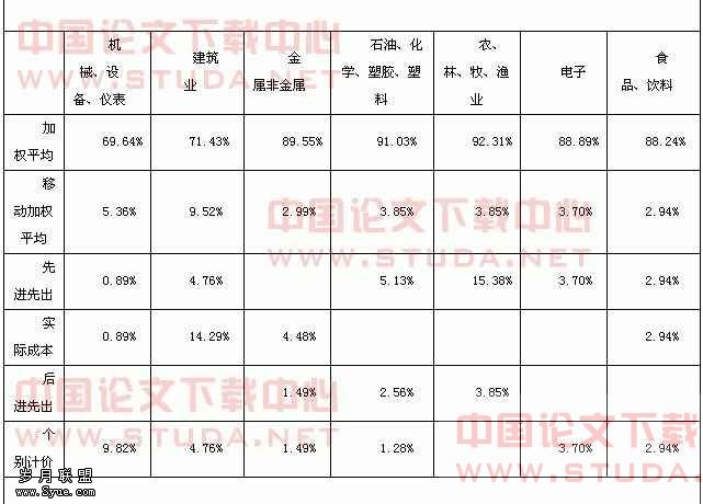 本文采用的统计方法是通过查阅各上市公司的年度财务报表附注,将其所选用的存货计价方法列示出来,分别统计每个行业中使用各种存货计价方法的的个数,继而出每种方法在各个行业使用的百分比及总体使用情况。