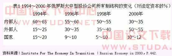 俄罗斯私有化方案规定企业51%股份须出售给职工,其余的49%或者在拍卖会上出售,或者由国家持有,本企业的职工按照国有资产委员会规定的企业股票的票面价值的1.7倍的价格加以购买。这样,虽然企业的所有权表面上已经变为企业职工所有权,但由于这51%的股票不仅由职工把持,企业的国家主管机关也有权支配。由于不少主管机关的官员认购了最大限额的股票,使得51%股份份额中相当部分的股票集中到了管理阶层的手中。根据俄罗斯联邦经济部在1995、1997、1999年对企业所做的调查资料,1994年第一季度,大多数企业是由全体职工拥有多数股权,所有外部股东大约拥有这些企业1/5的股票,国家仍拥有大约1/10以上的股票。1994年,俄罗斯全部大中型股份公司所有制结构中,内部人、外部人和国家持股的比重为:60~65;15~25;15~20.1994年7月以后,俄罗斯的私有化进入了现金私有化阶段,政府希望通过这一方式筹集资金弥补财政赤字,并加强外部投资人在公司治理结构方面的作用。到1999年,这三者的比重大致保持在46%;42%;7%的水平。另一方面,外部所有权在俄罗斯企业中的力量十分有限。虽然在全国范围内,外部所有权平均为32%,但外部人只在19.8%的企业中占有多数股权,而内部人比重的下降在很大程度上是由于职工股比例的减少。1996年,金融—工业集团在1%的企业中拥有28%的股份;俄罗斯商业公司、投资基金以及公民在50%以上的企业中所占的所有权份额很小;外国公司仅在1%的俄罗斯企业中拥有51%以上的股份。