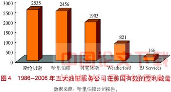首先是对拥有的知识产权的保护。随着油田技术服务公司每一项新技术的出炉,新技术的专利申请也提上了日程,因此,这些公司在海外设立研发机构时首先要考虑的一个重要因素就是东道国的知识产权保护状况。截至2005年底,Weatherford公司除了在美国本土的专利数量达到821项,正在申请的专利数量达到515项外,还同时在世界各子公司所在国拥有1209项专利,并立案申请1500项,专利保护期一般为3~20年。Weatherford公司2005年的财务报告显示,该公司专利资产净值约为8400万美元,2004年为8100万美元。