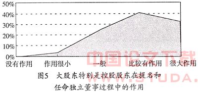 2.大股东特别是控股股东在提名和任命独立董事过程中的作用。《指导意见》指出,单独或者合并持有当时公司已发行股份1%以上的股东可以提出独立董事候选人,股东大会选举决定独立董事。依照“人”理论的假设,股东的最优选择就 是利益相关者或者自己的熟人,次优选择是不给他们带来“麻烦”的人。中国上市公司股权高度集中,在“一股独霸”的股东会上,独立董事选举任命难免被大股东操纵,在一股一权的表决制度下,符合大股东意愿的将顺利当选,余者将落选。调查数据证实了大股东对独立董事提名和任命的操纵,其中41%独立董事认为大股东在提名和任命过程发挥了比较大的作用,32%认为发挥了很大作用(见图5)。