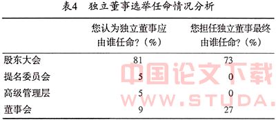 从表3可以看出,独立董事的提名情况符合《指导意见》的规定。被调查上市公司独立董事有62%是董事会提名产生,27%是控股股东提名产生,这一结果基本符合中国上市公司治理情况,与以往研究结果基本相符。上海上市公司董事会秘书协会和上海金信证券研究所所作的《现状调查:独立董事怎么样了?》中指出,近9成的独立董事提名基本由大股东或高层管理人员所包揽,其中55%的独立董事是由大股东推荐给股东大会讨论的,另有27%的独立董事由高层管理人员推荐,其他股东推荐的独立董事很少。上市公司存在明显的一股独大现象,公司董事会由控股股东控制,上市公司董事会缺乏规范的运作程序,董事会成为大股东的“橡皮图章”,因此。目前独立董事的提名基本由控股股东和董事会包揽。由监事会、其他非控制性大股东及中小股东提名的独立董事只占少数,约为11%。中国的监事会职责主要是财务检查监督权、对董事与经理履职的监督纠正权、提议财务报告审查权和提议召开l临时股东大会的权利。在“二元制”的公司结构下,存在独立董事与监事会部分职能重叠的情况,又由于监事会由股东大会和公司员工组成,监事会几乎完全受上市公司控制,很难起到监督作用,更难具有对独立董事的提名权了。虽然《指导意见》中规定,单独或者合并持有当时公司已发行股份1%以上的股东可以提出独立董事候选人,在控股股东掌权的情况下,考虑履职成本,其他非控制性股东和中小股东很难有发言权,同时中小股东一般注重的是短期利益,获得差价是其目的,由其提名独立董事实际上难以实现。