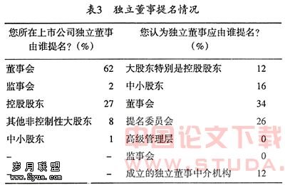 《指导意见》中规定,上市公司董事会、监事会、单独或者合并持有当时公司已发行股份1%以上的股东可以提出独立董事候选人,并经股东大会选举决定。由于中国股权结构的特殊性,独立董事的提名权多数控制在少数人手里,这在一定程度上影响了独立董事的独立性。鉴于此,笔者对独立董事的提名情况进行了调查、分析(调查结果见表3)。