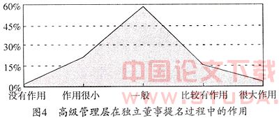 1.高级管理层在独立董事提名过程中的作用分析。中国上市公司普遍存在着“一股独大”的情况,而且是国有股一股独大。部分上市公司存在所有者缺位的问题,这就造成以总经理为代表的高级管理层控制上市公司的问题,独立董事的提名和选拔亦在其中。从图4可以看出,高级管理层在独立董事的提名过程中发挥的作用呈正态分布。说明独立董事对高级管理层在提名过程中的作用的认识是合理的,既不会出现高级管理层完全控制独立董事的选择,使独立董事成为其代言人,损害股东和其他利益相关者利益的问题,也不会出现高级管理层对独立董事提名视而不见的情况,毕竟独立董事制度是被作为一项改善上市公司不完善的公司治理结构的监督机制引入,独立董事在上市公司重大事项上有发表独立意见的权利,影响着高级管理层的选择和任命。