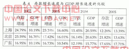 结合GDP的增长速度,我们可以看出,在2002、2003中,上海的存款增长速度都远高于GDP的增长率,说明在上海地区资金非常充裕,完全能支持GDP的发展,甚至GDP的发展、投资的需求比不上资金的供给速度。但在2004、2005年存款增长速度已经低于GDP的增速,资金的短缺开始有所显示。在广东除了2004年外,其他年份两者数据相差不是很大,说明资金利用率较好。北京在2002、2003年也同样出现了上海的情况,但在2004年的调整后,2005年存款又有了快速的增长,保证了产业结构升级所需的资金来源(见表4)。