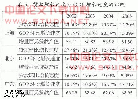 利用贷款增长速度与GDP增长速度的比较可以衡量贷款投放速度与经济增长速度的均衡及贷款的投入产出效益。从表5可以看到,三个地区在2004、2005年的贷款增长速度都有了明显的放慢,这与融资渠道的扩展分流了部分银行客户是分不开的。 同样地,原在2002、2003年贷款速度远高于同期的GDP增长速度,但在后两年就有所回落,贷款投放速度不及GDP增长速度,这说明支持的资金不再大部分来源于银行贷款,而有了其他的途径。从贷款的投入产出效益来看,广东在这方面增量百元的贷款产值最高,而北京最低,上海居中。说明广东贷款的质量较好,对于经济发展的贡献率最大。