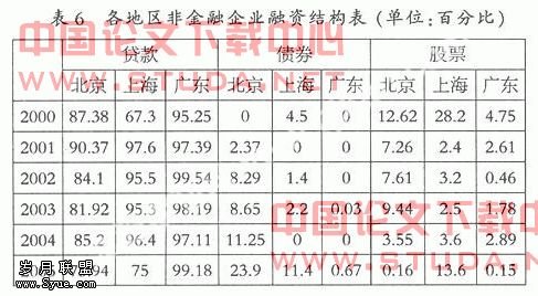 从表6来看,广东非金融企业的贷款比重很高,而债券融资几乎为零,股票所占比例也很低,仍以间接融资为主。北京的债券融资比重在三地中最高。根据北京产业结构调整的思路,第三产业是发展方向,第二产业向高端化发展,第三产业吸纳贷款的能力弱于第二产业,第二产业高端化使其对贷款的需求集约化,对北京贷款的整体规模增长产生深远影响。2005年,北京直接融资加速发展的图景变得越来越清晰,短期融资券井喷式发展、企业债发行提速、更多资产证券化产品的涌现、几乎没有悬念的IPO和再融资功能的恢复、境外股权融资都将推动直接融资的发展,产业结构升级所需资金逐渐转变成由直接融资提供,对银行信贷的依赖度有所下降。单就短期融资券而言,2005年在京企业分到接近60%的份额,达到834亿元。短期融资券发行对北京的银行贷款替代总量在400亿元以上。因此,应在此基础上,更大力地发展股票、债券融资。