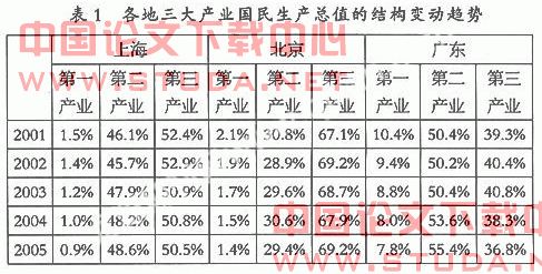 从表1可以得知,横向比较而言,上海第一产业所占比重最低,而北京的第三产业最为发达,而广东仍以第二产业为重,且第一产业所占比重在三者中最高,第三产业的比重最低。其中部分原因是因为以省为单位,广东省内还包括许多第三产业较为落后的城镇,因此在结构上第一产业的比重还很高。但另一方面也说明了广东以为主,服务业水平还有待提高。