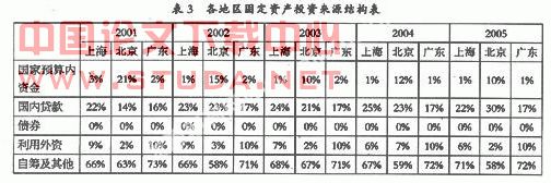 从表3可以看出,在结构方面,除上海有少数的固定投资资金来源于债券以外,北京、广东在这方面的数量均为零。这表明三者在利用债券进行融资方面的改革做得还不够,以后应注重扩充这方面的资金来源。而广东的自筹资金比重最高,都占到70%以上,其次是上海,最后是北京。同样现象也出现在利用外资方面。北京一个显著的特点就是国家预算内资金所占比例较其余二者大得多,上海、广东只有一两个百分点,而北京的国家预算资金虽然有逐年下降的趋势,但仍保持在总比例的10%以上。在国内贷款方面,北京无论在绝对值还是结构上均呈明显的快速上升趋势,到2005年比例几乎占到30%。上海在这方面比较稳定,在2005年甚至有轻微的下降,下降的资金部分由自筹资金所代替,广东在贷款的比例上最低,一直不到20%,与它在自筹资金及利用外资的优势上差别明显。广东的民间资本为经济发展、产业结构优化升级提供了强有利的支撑,但产业结构升级主要是大力发展高新技术产业,高新技术产业往往需要大量的资金进行支持,而单一的依靠自筹资金的融资结构必然会显示出它的缺点。因此,必须逐步大力发展其他融资渠道,如国内贷款及债券、证券市场。金融支持体系必须为高新技术的不断升级提供有效的融资渠道,才能保证在不同的发展时期都能获得充足的资本投入。