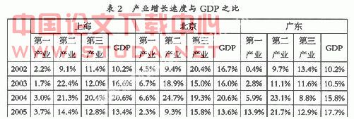 与它们各自的GDP比较而言,各地的第一产业与GDP增长速度有明显差距,GDP的增长对于上海、广东来说主要由第二产业带动,而北京是由第三产业带动(见表2)。