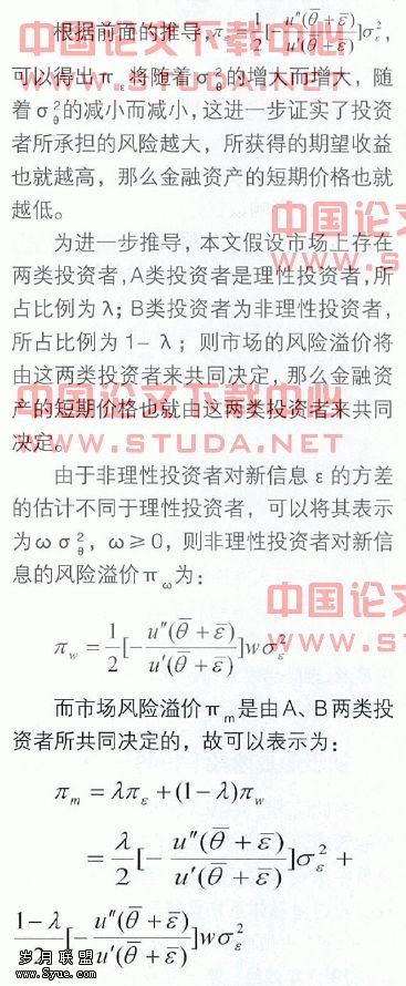 如果市场上的非理性投资者为过度自信的投资者,这类投资者通常过小的估计新信息的方差,则此时0<ω<1,那么这时市场上的理性投资者越多,市场风险溢价就越高,资产的短期价格也就越低;而如果过度自信的投资者越多,则市场风险溢价越低,金融资产的短期价格也就越高。