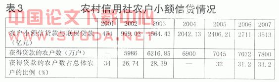 目前农村小额贷款政策措施不仅仅在农村信用社中得到了很好地贯彻实施,而且已经拓宽到所有银行业金融机构。农村信用社以外,在农村地区经营的金融机构陆续在探索开办各种形式小额贷款业务,对农户贷款的覆盖率已达30%多,基本能够满足农民小额贷款和生产的需求(表3)。