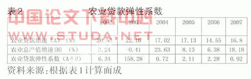 在此,我们选用弹性系数作为分析工具,分析和判断农业贷款与农业总产值的增长是否同步,以及协调程度如何。当农业贷款的弹性系数大于1时,反映农业贷款的增长快于农业总产值的增长,反之,则相反。如果弹性系数为1时,表明农业贷款与农业总产值增长同步;当弹性系数大于1时,表明农业贷款的增长快于农业总产值增长,当弹性系数小于1时,表明尽管农业贷款绝对量可能增大,但农业贷款的增长速度慢于农业总产值的增长速度。我们从近6年的农业贷款弹性系数分析发现,在发展趋势上,我国农业贷款的增长速度高于农业总产值的增长速度,这也反过来进一步证实,我国农业贷款的使用效率有待进一步提高(表2)。
