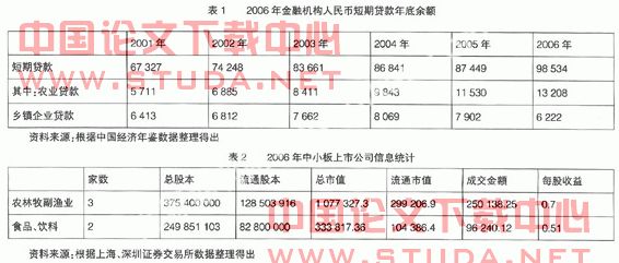 目前,我国资本市场对农业小企业的支持服务力度较间接融资市场更小。对于当前本身欠发达的资本市场而言,农业小企业自身存在的问题与风险使得其直接融资更加困难。虽然,我国已于2004年5月在深交所设立了中小企业板,但其较高的准入条件与真正意义上的创业板市场还有一定的差距。截至2006年底,我国有181家中小企业上市融资,但这与4 200多万家中小企业的总量来说是杯水车薪。其中农、林、牧、副、渔业上市公司有3家,食品、饮料上市公司仅2家。而对于众多的农业小企业来说更是可望不可及。由此可见,资本市场结构的缺失与功能的不足,使得农业小企业基本失去了直接融资的渠道。