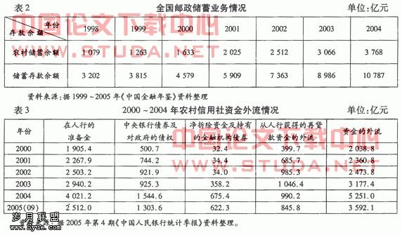 3.邮政储蓄转出大量农村资金。国有商业银行收缩在农村领域的战线以后,农村金融资源已主要向邮政储蓄集中,邮政储蓄机构成为农村信贷资金的“漏斗”。邮政储蓄规模发展较快,年增额从1998年的613亿元增长到2004年的1801亿元,2004年底余额已达10787亿元(见表2),其中乡镇及其所辖地区农村储蓄占全部邮政储蓄的34.11%。邮政储蓄不发放贷款,资金全部转存中国人民银行,直接流出了农村。2003年底,中央政府调低了新增邮政储蓄转存中央银行的利率,并试图建立起一种有效衔接邮政储蓄资金与农村信贷资金之间的关系。经过几年努力,邮政储蓄银行终于挂牌成立,发放小额质押贷款也开始试点,一定程度上解决了“只存不贷”问题,但邮储资金外流问题并没有彻底解决。