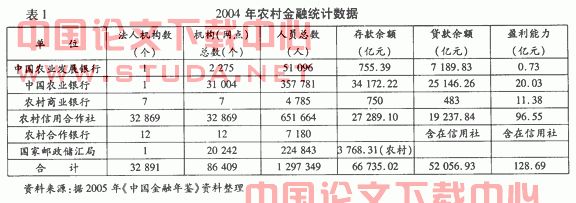 经过四个阶段的改革,取得了阶段性的成果,初步改变了我国农村金融机构长期以来商业性、政策性、合作性功能混淆不清、利益冲突、机构单一的局面,形成了包含商业性金融、政策性金融和合作性金融在内的农村金融体系(见表1)。这一农村金融体系在促进农村经济发展中发挥了积极的作用。截止到2004年底,我国共有农村金融机构法人32891个,机构(网点)达86409个,从业人员129万多,吸收存款约66735亿元,发放贷款约52057亿元,盈利128亿元。尽管农业银行发放的农业类贷款仅有4636.10亿元,邮政储蓄只存不贷,但是这些农村金融机构提供的存贷款、结算、汇兑、信用卡、担保等金融业务,促进了农村经济的发展。