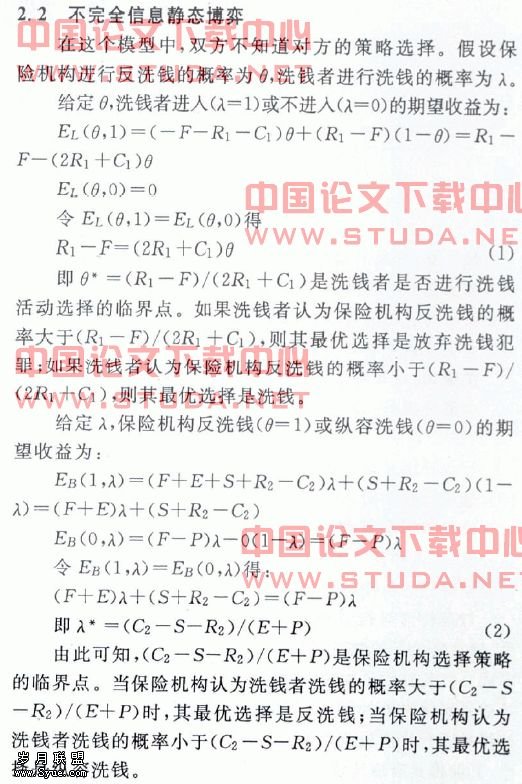 ? 因此,在中央银行介入的保险机构与洗钱者不完全信息静态博弈中,其均衡解是:θ?*(R?1-F)/(2R?1+C?1),λ?*(C?2-S-R?2)/(E+P)。由此可知,在均衡状态下,有(C?2-S-R?2)/(E+P)比例的洗钱者挺而走险进行洗钱活动,而保险机构以(R?1-F)/(2R?1+C?1)的概率对可疑交易进行抽查。??
