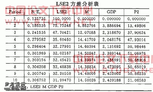 从表中可以看出,实际汇率LSE2的波动在第1期只受自身波动冲击的影响,从第2期开始来自LSE2自身的扰动逐渐下降,到第5期以后基本稳定在32%左右,这与脉冲响应的结论相一致;货币供应量M的变化对实际汇率LSE2的波动的影响逐渐上升,然而到第4期后基本稳定在14%左右;产出GDP的变化从长期来看只能解释实际汇率LSE2波动的2%左右,这与前边的格兰杰因果检验结论一致;而物价相对变动P2对实际汇率LSE2波动的解释能力从第2期开始逐渐增加,到第5期以后基本稳定在50%左右,起主要作用。?