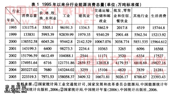 工业化和城市化进程的加快急剧地扩大了能源消费需求,而我国能源消费需求又主要集中在工业、建筑业和运输等三大行业部门。1995年工业、建筑业和交通运输三大行业能源消费量为103388.70万吨标准煤,占当年能源消费总量的78.82%,2005年三大行业能源消费量为178139.50万吨标准煤,占当年能源消费总量的79.77%(见表1)。尽管1995—2005年工业、建筑业和交通运输等三大行业能源消费量占能源消费总量的比重没有多大变化,2005年的比重只比1995年高出不到1%,但三大行业的能源消费需求量却增加了72.30%。特别是工业和交通运输业自20世纪90年代以来对石油和电力能源消费需求呈急剧上升态势。就石油而言,20世纪90年代以来在国内石油产供能力短时期内难以大幅度增加的情况下,为满足国内石油需求只有通过扩大石油进口来实现。1993年之前,中国还是一个石油净出口国,而1993年之后已成为石油净进口国。1995年,中国石油净进口为1218.7万吨,而到2005年石油净进口达14275.1万吨[根据《BP世界能源统计2005》、国际能源机构(IEA)及美国能源署(EIA)网站数据整理而得]。另据国家海关统计,2006年中国进口原油14518万吨、成品油3638万吨,原油进口金额664.11亿美元,成品油进口金额155.52亿美元。随着石油进口的增加,中国石油进口对外依赖程度也随之提高,1994年中国石油对外依赖程度还只有1.9%,但到2003年却高达48.6%,并且石油对外依存度还在不断提高,中国已经成为一个石油消费与进口大国也已是不争的事实。因此,随着中国经济高速增长和经济总量规模的进一步扩大,能源需求还将持续较快地增加,能源供给压力加大,供求矛盾仍会长期存在,特别是石油天然气对外进口依存度将进一步提高,能源供给紧张格局在今后相当长一段时期内难以有根本性改变。