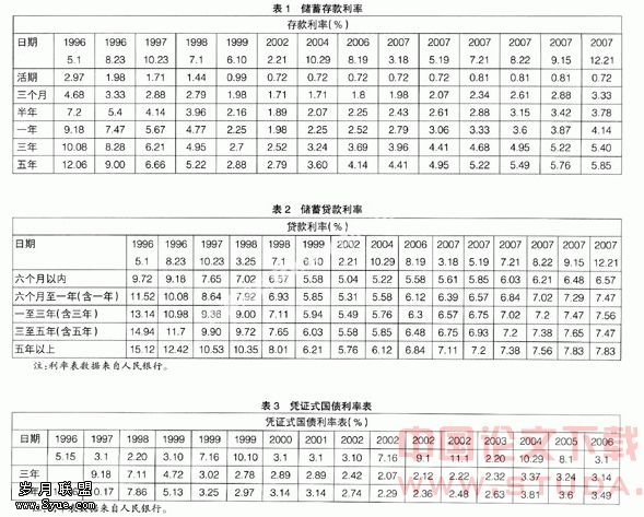 在金融管制放松和利率市场化的条件下,利率风险无时无刻不在,利率市场化的程度与利率风险成正比例关系,利率风险并非仅仅意味着损失和危机,如果有良好的管理手段和较高的管理水平,它既可以成为赚钱的工具,也可以化减损失。利率风险应该是一种不确定性,类似商品价格随市场情况而发生波动,也是市场经济无法回避的问题。近年来我国存贷款利率的变化很大,尤其是2007年,部分储蓄存贷款利率如表1—3所示: