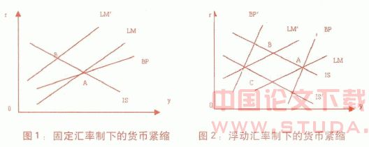 如图1,该国经济起初位于内外均衡的A点,此时国内经济过热,存在通胀的压力。如果央行实施紧缩性的货币政策,LM曲线左移到LM’,该国经济在B点实现新的内部均衡,此时由于收入减少引起经常项目顺差,同时利率上升,国外资金流入国内导致资本项目也出现顺差,本币面临升值压力.为维持汇率稳定,中央银行被迫干预外汇市场,购入外币,投放本币,其结果是LM’向右移动,重新回到原来的位置,货币政策并没有冷却国内的经济过热。由此可见,在资本不完全流动的情况下,固定汇率和货币政策存在着冲突,从而导致货币政策失效,大大降低了货币政策的独立性。