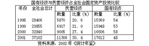 间接融资:也就是从金融中介机构获得的投资。金融机构的贷款,近年来随着金融体制的改革,各地纷纷建立起来了各种形式的贷款担保基金,信用贷款、抵押贷款方式等在一定程度上提高了银行对中小民营企业的贷款比例,但是由于体制等各方面的原因,长期以来银行等金融机构的贷款对象主要定位于国有大中型企业,据统计,1999年全年金融机构共发放贷款93734亿元人民币,其中发放给民营企业的约25054亿元人民币,占贷款总额的27%左右,而发放给国有企业的有63888亿元人民币,占发放贷款总额的69%左右。与民营中小企业的飞速发展相比,银行贷款的资金数量和比例远远不能为民营企业提供足够的融资服务。非正式金融市场,迫于从正式金融体系无法满足融资的需要,绝大多数民营企业在其发展过程中不得不从非正式金融市场上寻找融资渠道,通过高利率借贷等来筹集应急资金,使融资成本大大提高,阻碍了民营经济的正常发展。从下表可以看出民营经济和国有经济在社会固定资产投资中所占比例的差别。