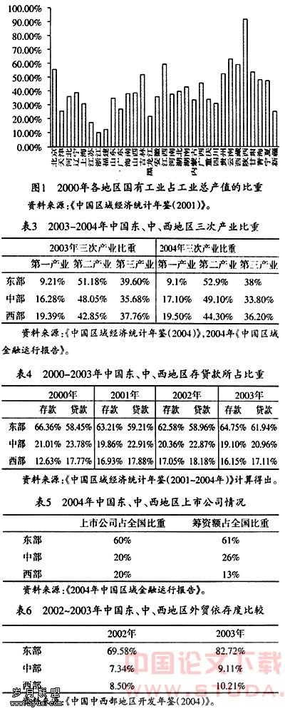 如图1所示,西部地区国有工业占工业总产值的比重整体上明显高于东部地区,东部地区除了北京比例较高为55.75%以外,其他省市都在40%以下,而西部除了内蒙古的33.22%和新疆的24.25%以外,其他省市的比例都在40%以上。国有工业对银行贷款有较高的依赖性,而西部地区国有的高比重决定了西部地区经济发展对银行贷款的高度相关性,国家若实行统一的货币紧缩政策必然会给西部地区带来更为严重的影响。