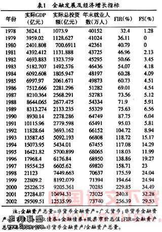 1. 资产数量增长较快,但资产结构不合理。20多年金融最显著的成就就体现在数量的快速扩张上。从1978年到2002年,中国狭义金融资产总值从1 174.1亿元增加到262 541.55亿元。相应的FIR从1978年的31.98%上升到2002年的256.39%,平均每年提高9.1%。但在金融资产总量增长的同时,金融资产的结构并不合理,突出的表现就是货币性金融资产比重过大。截至2002年底,中国金融资产总量中,货币性金融资产占全部金融资产的92.71%;即使股票按市值,货币性金融资产的占比也达到了70.47%。这种货币性金融资产占比过大会导致:(1)金融风险过度集中于中央银行。资产结构是信用形式结构的反映,货币性金融资产占比过大表明中国目前仍然是银行信用占绝大比重,而信用、个人信用等基础信用形式不发达,导致信用基础比较单薄,银行信用也因缺乏雄厚的信用根基而隐含了诸多风险。由于企业信用(包括商业信用、企业债务信用和股份信用)、基金信用、国家信用等信用形式比银行信用更具约束力,因而证券性金融资产较货币性金融资产的稳定性更强。同时,因证券的持有者是广大投资者而可以使金融风险相对分散。目前的金融资产结构中,货币性金融资产比重过高,不仅使中国金融资产的稳定性较差,而且使风险高度集中于银行,不利于金融发展。(2)资金分配效率不高。在货币性金融资产占主体的情况下,资金分配主要是通过银行信贷来实现的,而超过70%的银行贷款又主要集中于四家国有独资银行,渠道单一,权力过于集中,容易导致资金配置的低效率。并且,中国国有银行贷款主要发放于国有企业,而国有企业的经营不景气,造成不良贷款问题严重。目前因国企相互拖欠,导致国家银行应收而未收的利息高达2 000多亿元。这种资金配置的低效率使得金融资产总量的增长并未产生应有的效果,在模型中反映为FIR对产出的较小的影响。