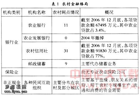 1、农村金融组织体系概况。目前,永春县农村的正规金融组织,除了四大国有商业银行外,还有农村信用社、邮政储蓄机构。2004年,农业发展银行撤掉后,现由农业银行、农村信用社形成了商业金融与合作金融分工协作的农村金融格局(见表1)。