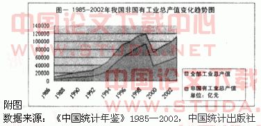 自改革开放以来,我国不断放宽非国有经济可进入领域,鼓励非国有经济特别是民营 经济发展。根据国家统计局数字,2003年我国非国有经济增加值达到21637亿元, 占全部工业增加值比重的52.7%。如果加上第一、第三产业中的非国有经济增加值,则 非国有经济比重将超过国有经济,成为我国国民经济的第一推动力量。图一列出了1985 —2002年间,非国有经济在我国工业部门中的地位和比重。