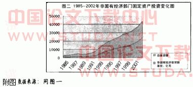 图二描述了1985年以来非国有经济投资总量及在国民经济中的比重变化情况。自1993 年前后起,非国有经济开始迅速增长,并在2002年达到了总投资的56.6%,超过了国有 部门,成为我国投资增长的第一推动力量。
