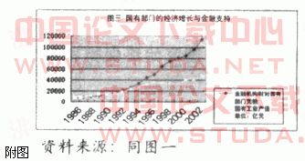 长期以来,中国金融体系承担着某种财政功能,特别是对国有经济的财政补贴功能(张 杰,1998;周立、胡鞍钢,2001)。这一点,在改革后所以尤显重要,主要原因在于国 家为了保证改革过程中的体制内稳定,而不得不对国有部门提供持续的补贴(张军,199 7)。因此,国家直接控制下的金融体系,将金融资源的绝大部分配置给了国有部门。尽 管国有部门的产出效率和产出总量,在整个国民经济中的重要性都在不断下降。