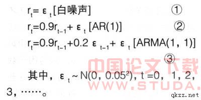 过程①指市场因子rt遵循白噪声过程。白噪声过程是个稳定过程,其隐含的意思是各期市场因子均不相关,适用于表示模型无法解释的纯随机波动。过程②指市场因子rt遵循一阶自回归过程。rt除了受当期随机扰动的影响,还受自身的滞后量rt-1的影响。过程③指市场因子rt遵循一般自回归移动平均过程ARMA(1,1)。rt除了受当期随机扰动和自身滞后量的影响,还受到上一期的随机扰动εt-1的影响。
