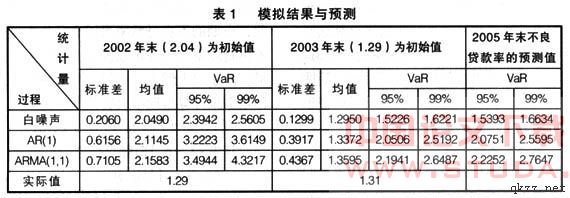 以2004年末的不良贷款率(1.31%)为初始值,分别用三种随机过程模拟5000次得到 2005年末不良贷款率的预测值如表1。即2005年末该银行的不良贷款率有95%的可能性小于1.5393(白噪声)、2.0751(一阶自回归)、2.2252(一般自回归移动平均);有99%的可能性小于1.6634(白噪声)、2.5595(一阶自回归)、2.7647(一般自回归移动平均)。