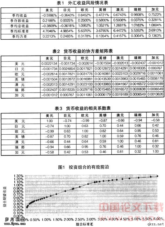 计算有卖空限制下的投资组合有效前沿 根据投资组合理论的均值-方差模型计算出七种货币进行组合的有效前沿(见图1),从图1中可以得出: