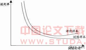 过度拟合可以通过评价样本等方法来解决,如图4,当训练不断进行,训练样本的误判率不断降低,而评价样本则呈现先降后升的情况,那么当评价样本的误判率到最低时,我们就应该停止训练。