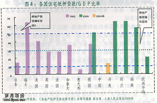 各国住宅贷款占 GDP 比值差别较大,但近年来显著提高,大多在 30% 以上,部分国家甚至达到 50% 。 80 年代美国的住宅债务存量/ GDP 为 37% ,德国为 20% ,而英国从 80 年代到 90 年代迅速增加,截止到 2000 年已从 23% 迅速上升到 57% 。德国未偿还抵押贷款占 GDP 比率 1997 年达到 50.9% ,丹麦达到 65% ,荷兰达到 60% ,瑞典达到 57% 。近年房地产信贷/ GDP 比率大约在 13% 。