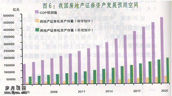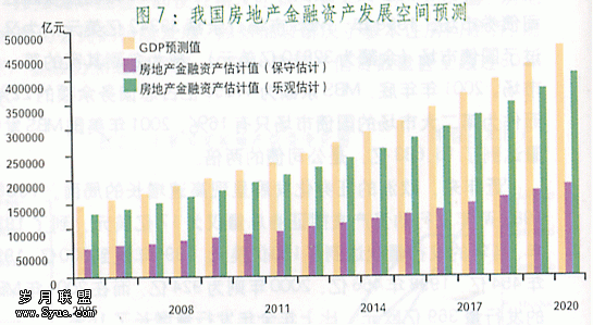 综合信贷资产和证券资产,我国房地产金融存量资产到 2020 年保守估计将达到 191329 亿元,相当于 GDP 的 40% ;乐观估计将达到 413728 亿元,相当于 GDP 的 88% 。 2004 年我国住宅金融资产低于 GDP 的 25% ,未来房地产金融发展空间巨大:证券化金融工具将逐渐增多,在融资结构中比率迅速上升;新的融资渠道和方法将部分替代传统的信贷融资,但占据主流地位的仍然是信贷金融。
