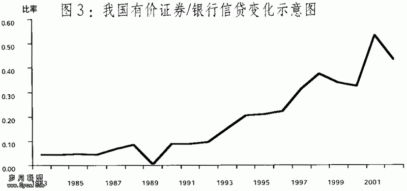 金融深化最重要的特征之一就是传统信贷融资逐渐减弱,证券融资比率逐渐提高。发达国家的银行信贷资产/证券资产的比率都有逐渐下降的趋势。一般认为,证券/信贷越高,金融的发达程度越高。目前证券信贷比为美国 3.5 : 1 ,德国为 1 : 1.4 ,日本 1 : 1.2 ,韩国 1 : 0.91 。