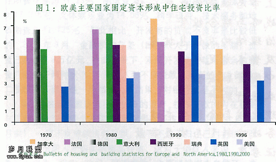 我们选取了东欧、中欧、西欧、北欧、南欧和北美的主要国家,观察 1970 年、 1980 年、 1990 年和 1995 年住宅投资和固定资本形成资金的比率。绝大多数国家固定资本形成中住宅比率都在 20% — 30% 之间。