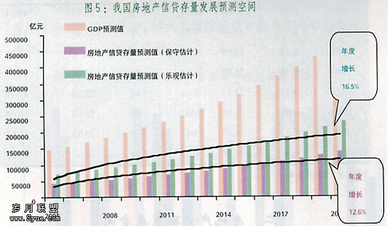 据测算,到 2020 年,中国 GDP 预计为 467693 亿,房地产信贷空间保守估计将达到 140307 亿,是 2004 年实际房地产信贷余额 23800 亿元的 5.9 倍,年均增长可达到 12.6% ;乐观估计将达到 233846 亿,为 2004 年的 9.8 倍,年均增长可达 16.5% 。