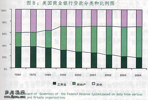 我国房地产金融结构的发展是不平衡的。由于我国的金融体系更接近于主银行制度,伴随着金融深化的进程,尽管住宅证券金融会得到迅猛的发展,但仍然难以取代信贷金融的主导地位。即使在资本市场非常发达的美国,房地产贷款 40 年增长了 88 倍,成为商业银行的第一大信贷资产,占到 2004 年总贷款的 52% 。