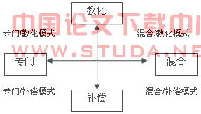从权力运作技术——即程序的结构与功能——角度进行的分类更有助于深入认识我国未成年人刑事和解运行机制中的国家权力特点。根据未成年刑事和解程序中司法权力的组织形态特点,可以分为专门模式与混合模式。专门模式是指,和解程序仅适用于未成年人,并由专门机关或部门主持,以适应未成年人的身心特点;混合模式是指,和解程序不分对象(成年人和未成年人),主持机关并不具有专门性。根据未成年人刑事和解程序的功能特点,可划分为教化模式与补偿模式。教化模式以“教育、感化、挽救”未成年人为基本功能需求,而补偿模式以被害人利益为中心,通过赔偿被害人以恢复其所遭受的损失。如图-3所示,以程序结构为一端,以程序功能为另一端,未成年人刑事和解可以有四种理论模式:专门/补偿模式;专门/教化模式;混合/补偿模式;混合/教化模式。