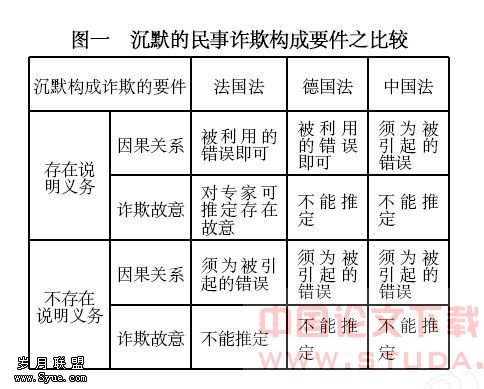 由上可见,关于诈欺的构成要件,在诈欺行为人不负说明义务的情况下,无论是法国法上,还是德国法上,诈欺行为、因果关系和诈欺故意这三个要件均未发生动摇。但值得注意的是,如图一所示,在认定诈欺行为人负有说明义务的情况下,沉默这种消极行为的诈欺构成要件,在法国法和德国法上均出现了不同程度的缓和。