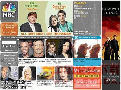正如上面所论述的一样,的设计也是至关重要的,在某种程度上也代表着频道的形象,我们将分两个部分论述,一是对整体页面进行设计构想,一是对栏目进行设计构想,下面是美国NBC电视频道的页面设计: