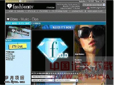 另外法国Fashion TV电视频道的品牌意识,从主页面打开其中的一个网页,中间部分就是Fashion TV电视频道的台标演绎,Fashion TV的台标是类似一个钻石的形状,用Flash制作,动感十足,质感细腻。并且左边的标示设计很有味道,“FTV LIVE”是黄色背景,黑色字体,对比反差很大,视觉感强烈。页面的背景是一个很摩登的女郎,她的比例占据了近1/3的页面,很有视觉冲击力,并且切合Fashion TV频道的主题。总之,Fashion TV电视频道的网络主页充满了时尚的元素,早已不在是停留在传播信息本身,更多的是在表达一种视觉的理念。具体见下图: