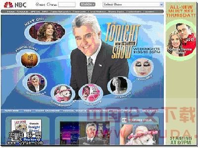 从上面的图中我们可以看出Suze Orman栏目的页面最为突出的主体就是该栏目的主持人Suze,她本人的图像占到了1/4页面,流露出与受众交流的表情,仔细观察我们会发现Suze的穿著会随时变化的,这期节目是这身穿着,到下期节目会是另一件穿着,这些变化在网页中都有体现,可见栏目制作者的细致程度。另外Suze Orman栏目页面包括了视频点击,栏目直播,Suze商店,Suze介绍等等,色彩运用上与频道整体网页有所不同,主体色彩为蓝色,力求栏目统一的效果。同时也注意了动感的设计,点击一些链接,会有动态的效果出现。下面我们再来看一文件NBC频道脱口秀栏目的页面设计,具体见下图: