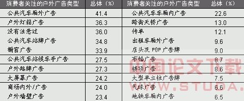 在这一部分我们主要是着重分析其它形式的媒体在频道品牌传播过程中的作用,在这里其它媒体类型主要是指户外媒体类型,因为我们在频道品牌推广过程中免不了用到广告,户外广告具有到达率高,覆盖广,形式灵活,广告信息刺激诱人等特点引起了我们的关注,户外广告良好的视觉表现力能够起到很好的传播效果,下面是受众最为关注的户外广告类型: